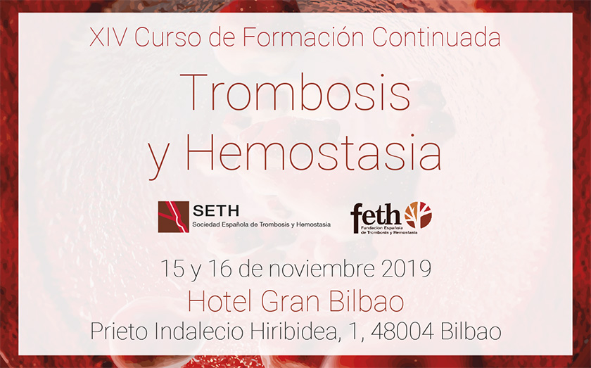 Los días 15 Y 16 de noviembre de 2019 tendrá lugar el "XIV Curso de Formación Continuada Trombosis y Hemostasia" en el Hotel Gran Bilbao . El Curso está coordinado por los Dres.: Mª Eva Mingot Castellano y Constantino Martínez Gómez y organizado por la Sociedad Española de Trombosis y Hemostasia.