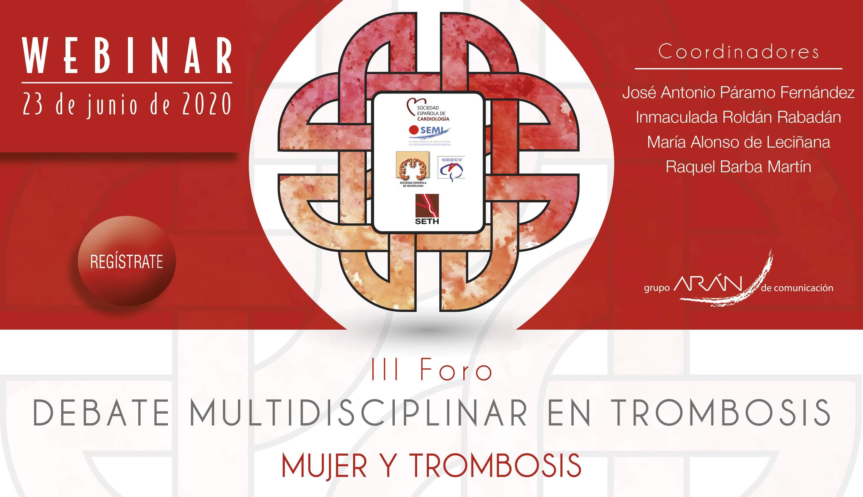 El próximo 23 de junio de 2020 se celebrará el WEBINAR del III FORO DE DEBATE MULTIDISCIPLINAR EN TROMBOSIS "MUJER Y TROMBOSIS" coordinado por la Sociedad Española de Trombosis y Hemostasia (SETH), la Sociedad Española de Cardiología, la Sociedad Española de Neurologia (SEN), Grupo de Estudio de Enfermedades Cerebrovasculares (GEECV)  y la Sociedad Española de Medicina Interna (SEMI)