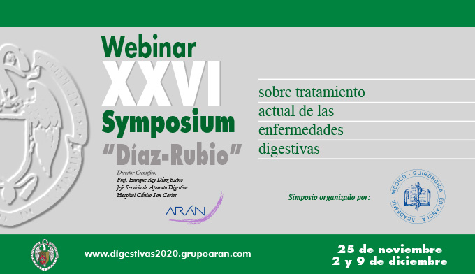 Los días 25 de noviembre, 2 y 9 de diciembre de 2020 se celebrará el “XXVI Symposium “Díaz-Rubio” sobre el tratamiento actual de las enfermedades digestivas” en formato virtual.