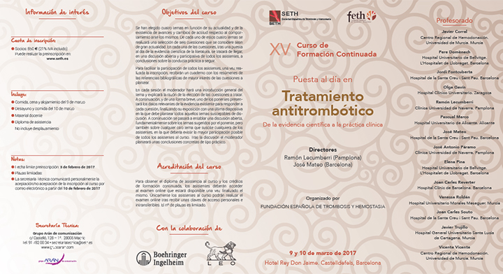 Los días 9 y 10 de marzo de 2017 tendrá lugar el "XV Curso de Formación Continuada de Puesta al Día en Tratamiento Antitrombótico: de la Evidencia Científica a la Práctica Clínica” en el Hotel Rey Don Jaime (Castelldefels. Barcelona). El Curso está dirigido por los Dres. Ramón Lecumberri y José Mateo y organizado por la Fundación Española de Trombosis y Hemostasia.