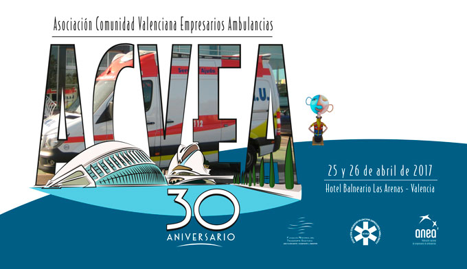 Los próximos 25 y 26 de abril de 2017, se celebrará en el Hotel Balneario Las Arenas de Valencia el “30. Aniversario de la Asociación Comunidad Valenciana de Empresarios de Ambulancias (ACVEA)”. Este evento está organizado por la Federación Nacional Empresarios Ambulancias (ANEA) juntos con la Asociación Comunidad Valenciana de Empresarios de Ambulancias (ACVEA).